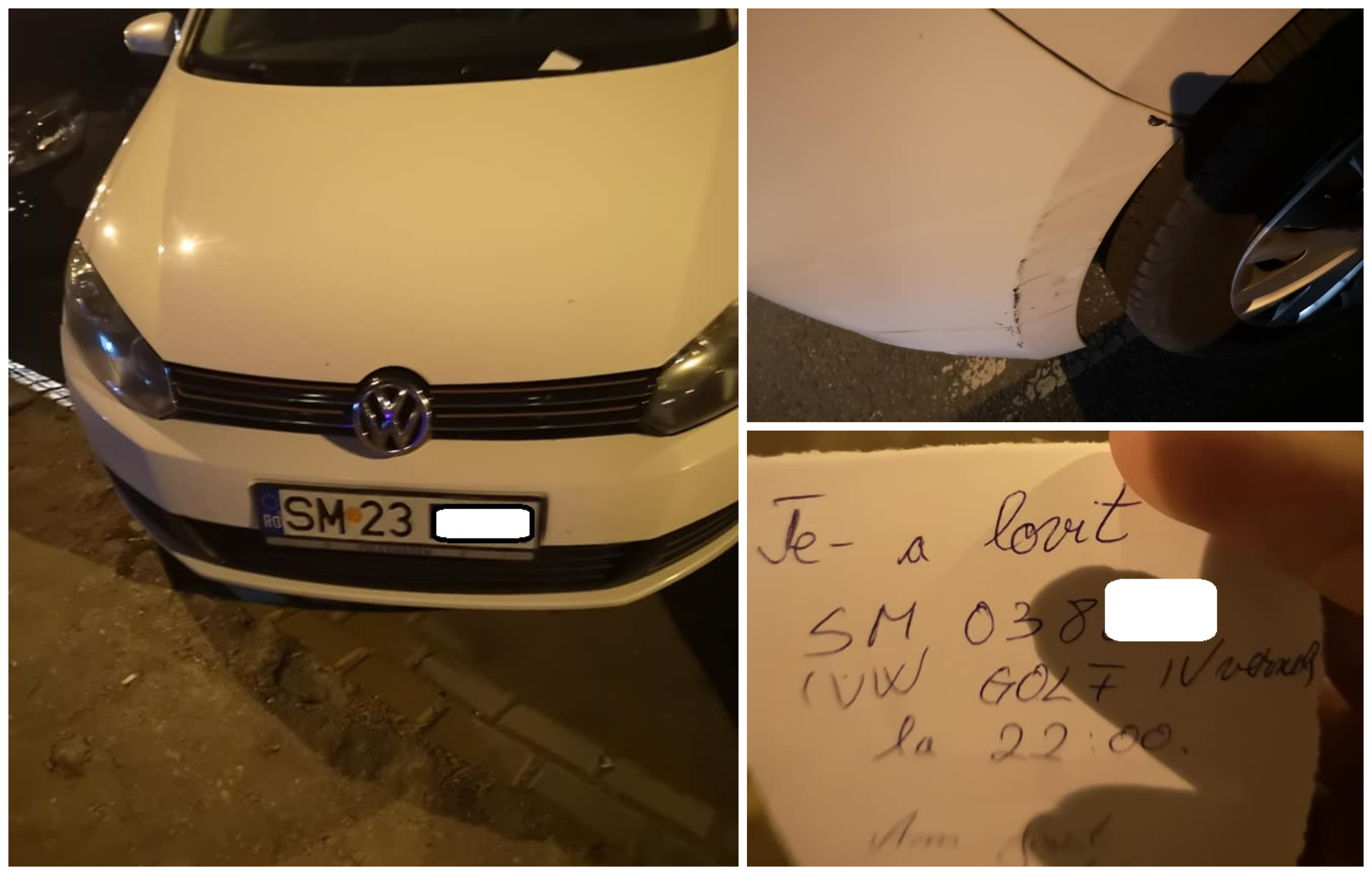 ”SM 23 D... ai fost lovit de o domnișoară care a condus un VW Golf 4 vernil, SM 038..., nu a știut să iasă de lângă tine (de 3 ori a lovit) din parcare din față de la Corso. Nici nu a coborât să se uite ce a făcut!”, spune martorul ocular.