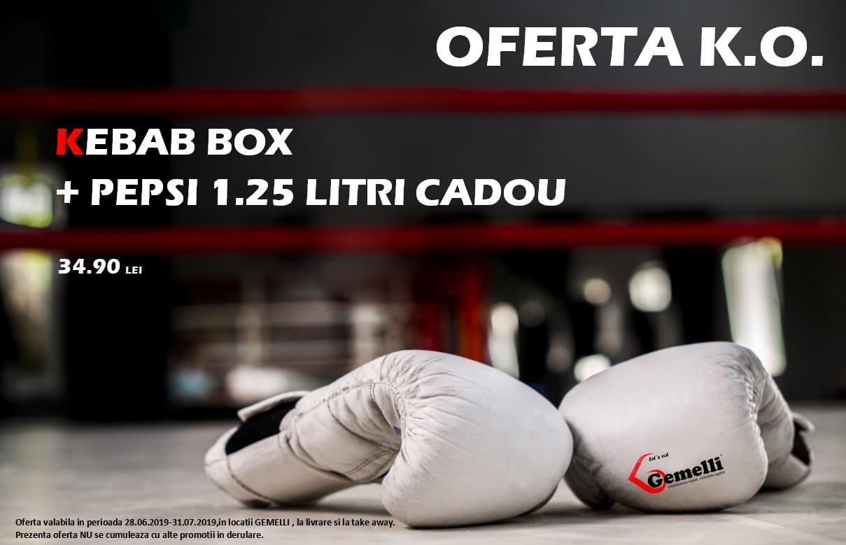 Cantitatea de suc este mai mare dacă comandați un Kebab Box, gândit de cei de la Gemelli. La prețul de 34.90 lei primiți cadou un Pepsi la 1,25 litri.