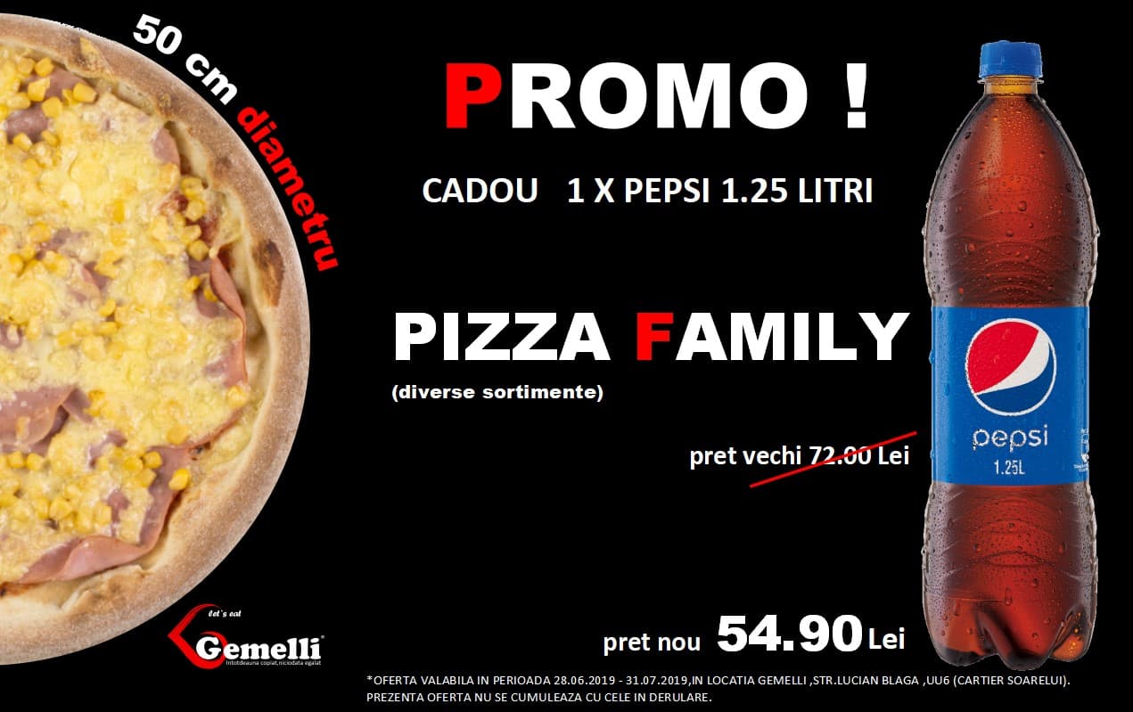 Și ca meniul să fie complet, în localul Gemelli, situat pe Bulevardul Lucian Blaga, la doar 54,90 de lei primiți o pizza uriașă, pentru întreaga familie, plus un Pepsi de 1,25 litri, din partea casei.