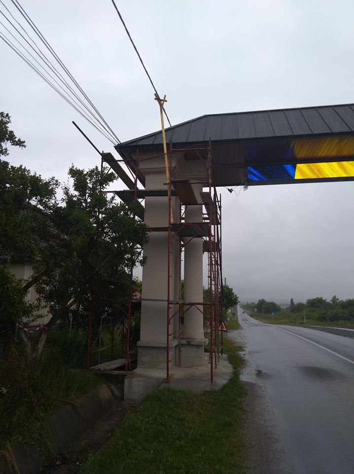FOTO. Poartă uriașă, printre cabluri de curent, la intrarea într-o comună din județ