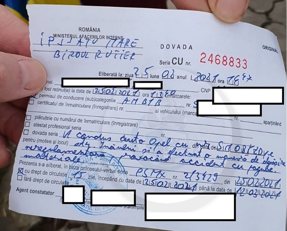 ”A condus auto Opel pe strada Inăului și a efectuat o manevră de depășire neregulamentară, provocând accident cu pagube materiale”, este concluzia agentului constatator.