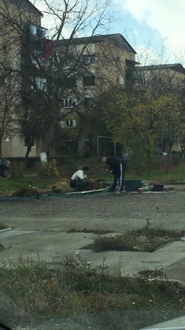 Imagini inedite în Cartierul Micro 17 din municipiul Satu Mare. Câțiva sătmăreni au înjunghiat un porc și au încins oalele pline cu apă şi s-au apucat de pârlirea porcului.