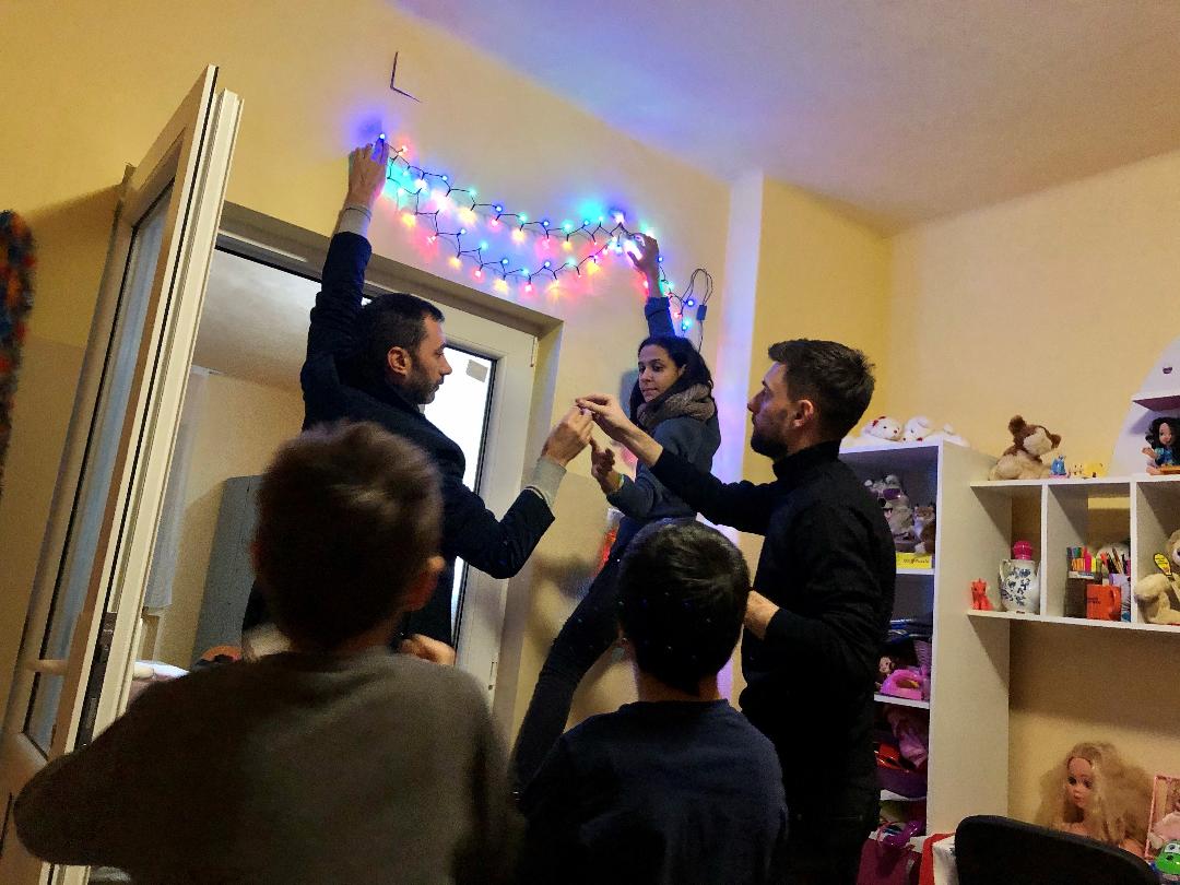 Bradul de peste trei metri înălțime din curtea casei, primit și el cadou de la un alt spiriduș, a fost împodobit în timp ce copilașii cântau colinzi alaturi de personalul casei și de membrii asociației. Și mai mare a fost bucuria când, după împodobirea bradului, s-a ornat fiecare cameră cu luminițe care să le țina companie până la venirea lui Moș Crăciun.