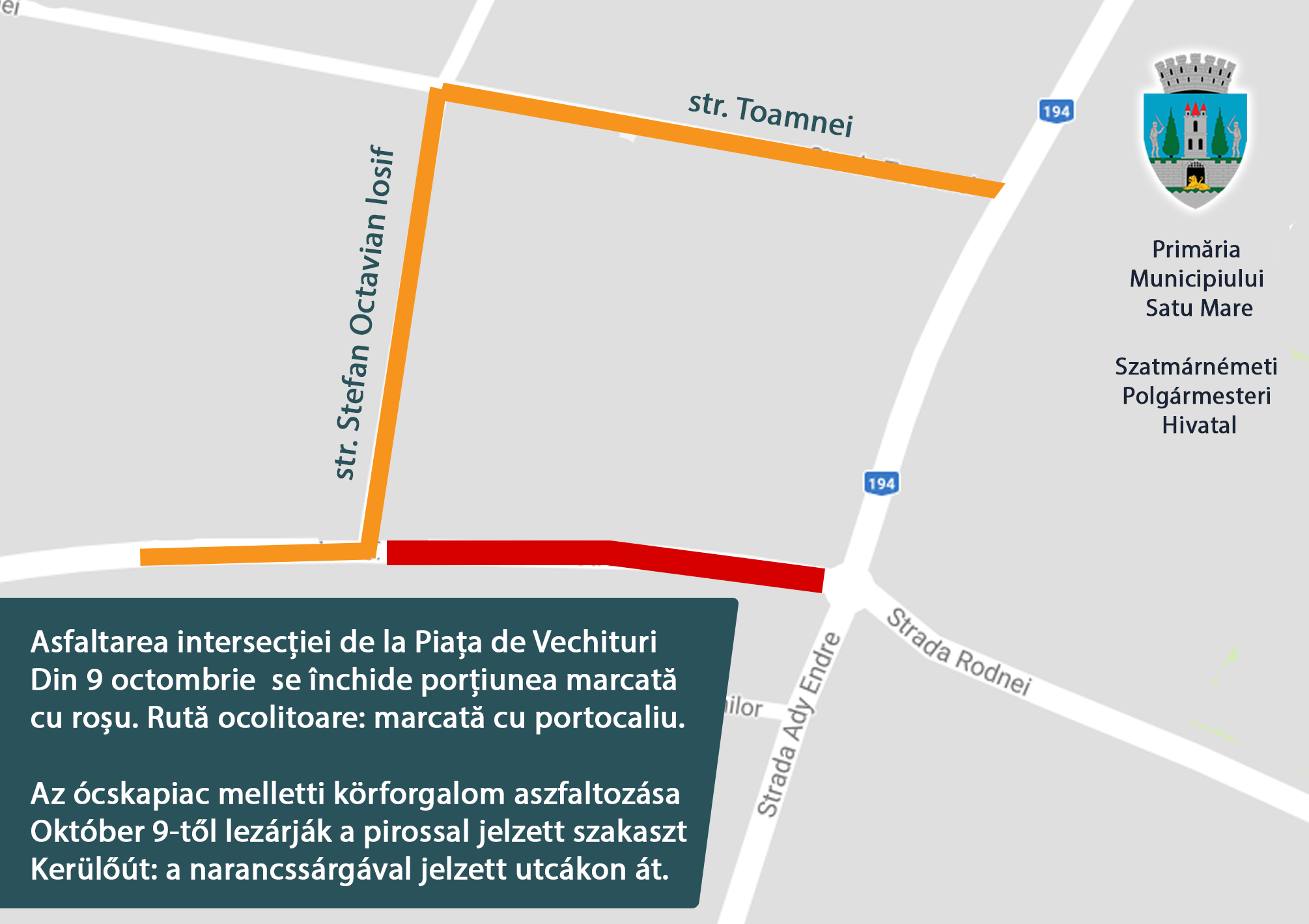 Primăria Municipiului Satu Mare anunță demararea lucrărilor de reparații în sensul giratoriu de lângă Piața de Vechituri, respectiv pe o porțiune a Străzii Lăcrămioarei.