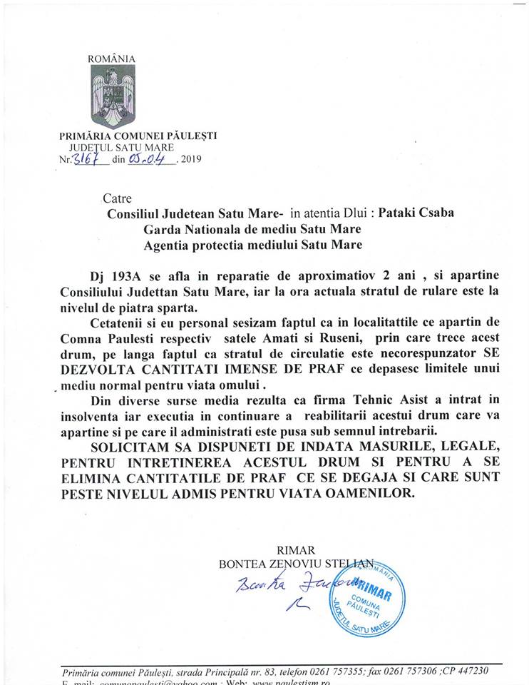 Primarul comunei Păulești, Zenoviu Bontea, nu a mai rezistat și a trimis o adresă către conducerea Consiliului Județean prin care solicită identificarea unor soluții urgente pentru reabilitarea Drumului Județean 193A.