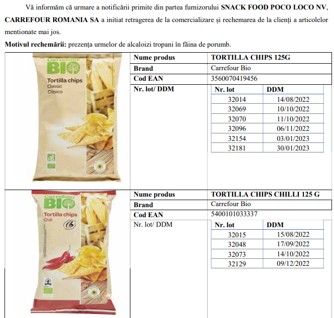 Autoritatea Națională Sanitar-Veterinară și pentru Siguranța Alimentelor (ANSVSA) și Carrefour România anunță retragerea de urgență a unor produse de pe rafturi.