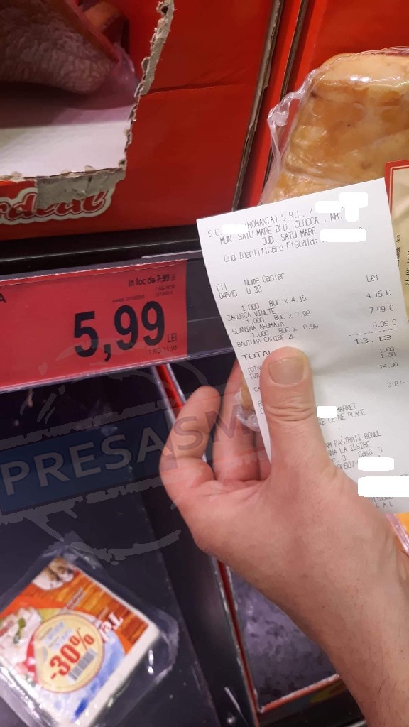 O sătmăreancă s-a dus într-un supermarket din municipiul Satu Mare să-și cumpere slănină. S-a dus la raft și a văzut un preț care i s-a părut ofertant: Slănină la 5,99 lei. A pus produsul în coș și a mers la casă.