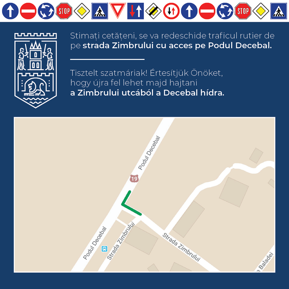 Primăria Municipiului Satu Mare aduce la cunoștință publică faptul că strada Zimbrului, cu acces pe podul Decebal, a fost redeschisă traficului rutier. Măsura a fost luată pentru fluidizarea circulației rutiere, cu avizul Poliției Municipiului Satu Mare.