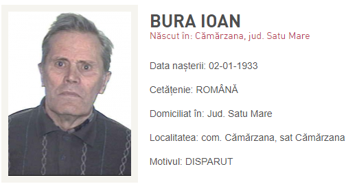 Ioan Bura a dispărut de la domiciliu în data de 26.11.2018, orele 13:00, atunci când a plecat și până în prezent nu a revenit. Semnalmente: Înălțime - 160 cm, greutate - 65 kg, ochi căprui, păr grizonat, fără semne particulare.