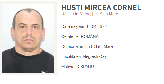 În data de 10.07.2018, Mircea Cornel Husti a plecat în mod voluntar de la domiciliu, precizând că se duce în vizită prin țară fără să specifice locul unde se deplasează și pentru ce perioadă, fiindu-i procurate înainte de plecare mai multe bilete de transport CFR pe rutele Negrești Oaș-Timișoara-Brașov-București. Are deficiențe de vorbire și semipareză la membrele superioare. Obișnuia să plece în fiecare an prin țară și se întorcea după câteva zile.