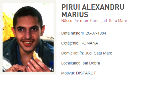 În data de 18.09.2006, Alexandru Marius Pirui a plecat voluntar de la domiciliu și nu a mai revenit. Persoana este bolnavă psihic. A mai plecat în repetate rânduri, dar revenea singur la domiciliu.