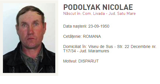 Podolyak Nicolae a fost dat dispărut de la domiciliu în data de 17.11.2005. Semnalmente: 1,65 m înălțime, corpolență atletică, ochii albaștri, părul șaten.