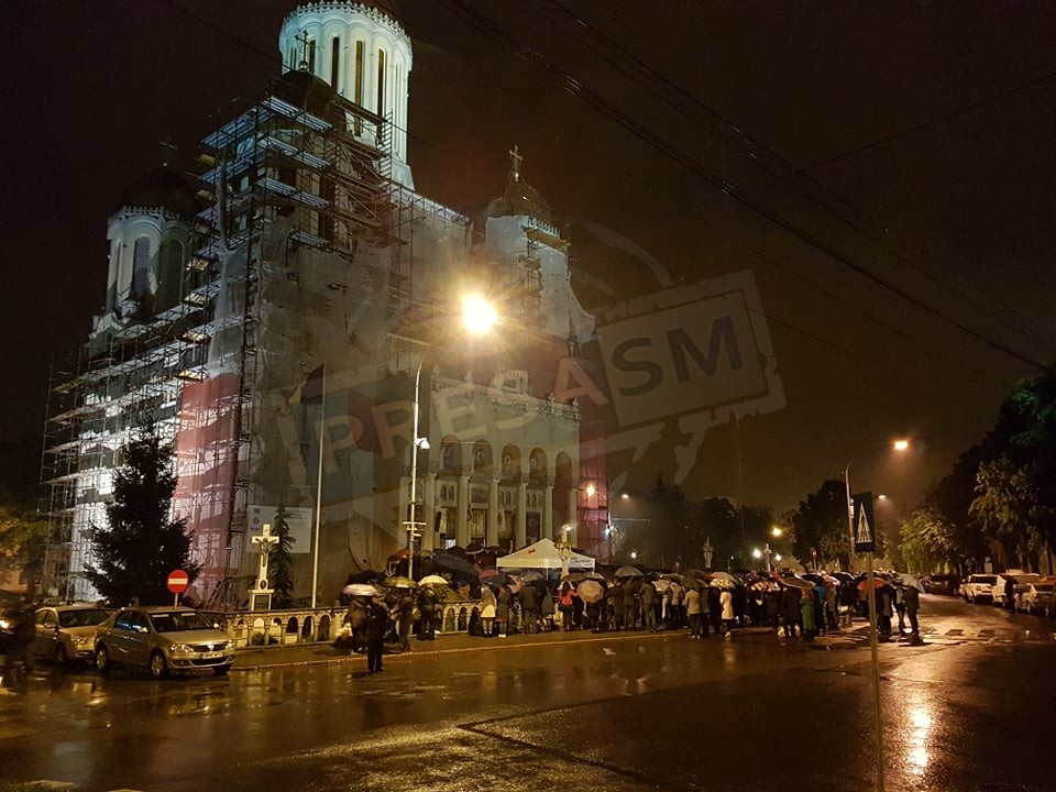 Și Catedrala greco-catolică "Sf. Arhangheli Mihail și Gavril" a fost plină de credincioși în noaptea de Înviere. Cei care nu au mai avut loc în biserică și-au protejat coșurile cu umbrele și au așteptat momentul în care preotul a anunțat Învierea Domnului.