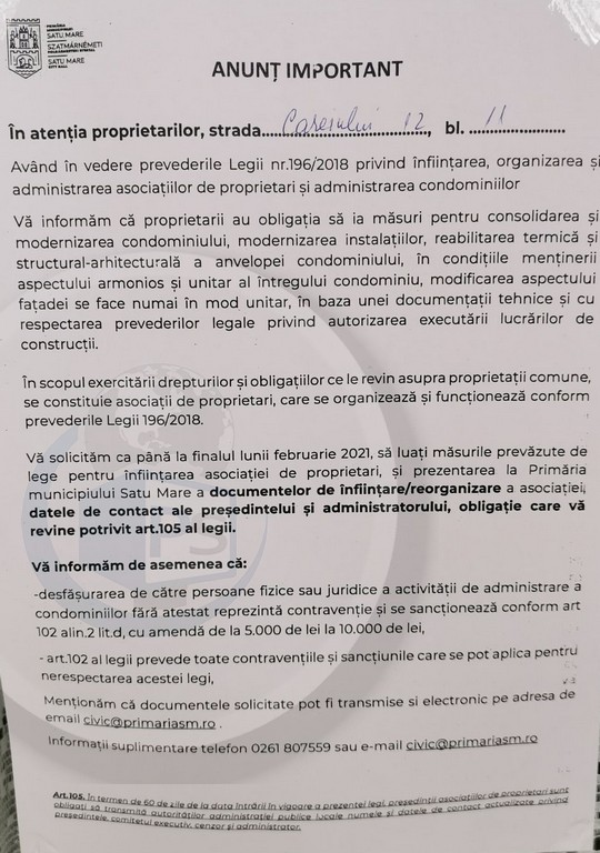 ”Vă solicităm ca până la finalul lunii februarie 2021 să luati măsurile prevăzute de lege pentru înființarea asociatiei de proprietari și prezentarea la Primăria municipiului Satu Mare a documentelor de înființare a asociației (...) Desfăsurarea de către persoane fizice sau juridice a activității de administrare a condominiilor fără atestat reprezintă contravenție și se sancționează cu amendă de la 5.000 de lei la 10.000 de lei”, este anunțul Primăriei Satu Mare.