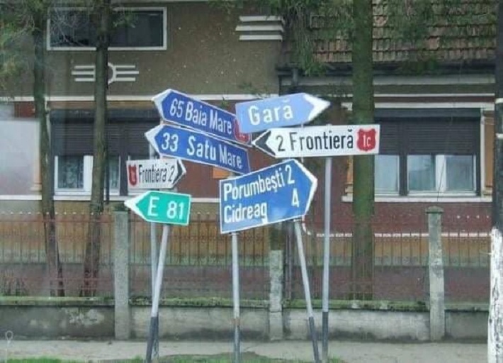 Imagini cu iz tragi-comic la doi kilometri de Punctul de Trecere al Frontierei de la Halmeu. Câteva indicatoare rutiere cam ”obosite” arătau, în urmă cu câțiva ani, că gara din localitatea se află undeva spre cer. La fel și municipiile Satu Mare și Baia Mare.