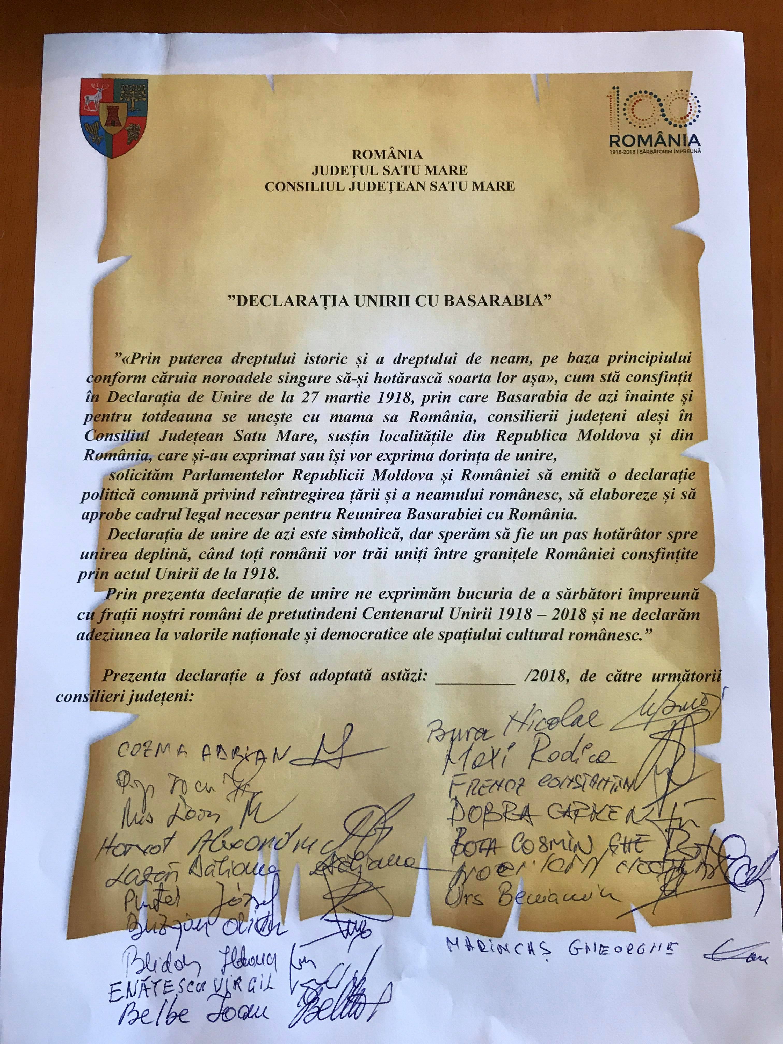 Consilierii județeni ai UDMR Satu Mare au refuzat să semneze astăzi rezoluția simbolică de unirea a României cu Basarabia. Propunerea îi aparține consilierului județean Adrian Cozma și a fost semnată de toți cei 18 consilieri ai PSD, PNL și ALDE.
