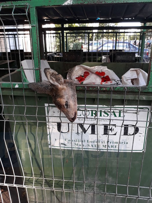 O căprioară a fost aruncată la un punct de colectare al deșeurilor din Cartierul Micro 16, pe strada Făgărașului. Descoperirea a fost făcută de un sătmărean, care s-a declarat șocat de ce a văzut.