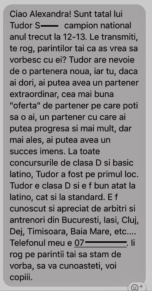 ”Consider că aceasta nu este o abordare etică! Părintele unui băiețel de la o altă școală de dans din Satu Mare, care caută parteneră de dans, insistă, sună de mai multe ori, scrie un mesaj la o fetiță de 12 ani de la noi, prin care transmite părinților ce bine ar fi să danseze copii împreună! Nu îl intereseaza că această fetiță are partener de mai mulți ani și au rezultate foarte bune, îl interesează doar să aibă băiatul lui parteneră, nu contează că ar despărți cu asta o pereche! "Tudor a fost întotdeauna pe locul 1..." cunoscătorii pot verifica și acum pe site-ul FRDS rezultatele! e o minciună... Părinții fetiței au o gândire total opusă, ne-au contactat, au rămas ca și noi neplăcut surprinși de acest mod josnic de abordare! Concluzie: dacă cauți partener(ă) copilului tău, adresează-te în primul rând conducerii școlii de dans sau antrenorilor, dar nici într-un caz nu prin copii, așa ni se pare corect și etic!”, a scris Lorant Loga, pe pagina sa de Facebook.