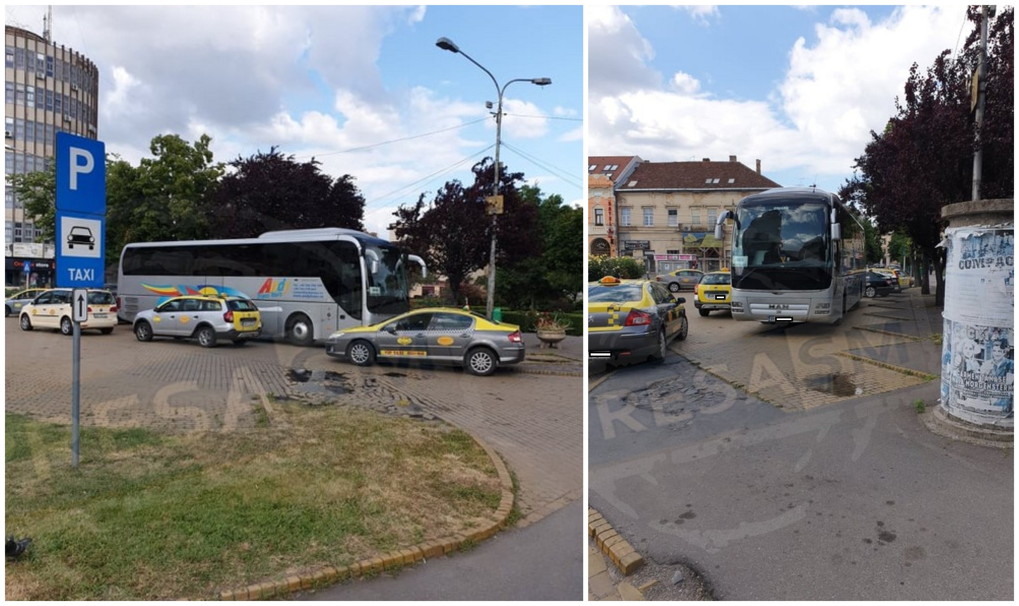 A városközponti taxisplaccra parkolt le egy Bihar megyei turiostabusz vasárnap délután. A sofőr mentségére legyen mondva, a közlekedési rendészek irányították oda.