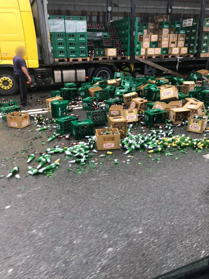 O veritabilă ”tragedie” pentru băutorii de bere s-a petrecut astăzi în județul Maramureș, pe Mesteacăn. Un TIR care transporta lăzi și butoaie cu bere a fost implicat într-un incident rutier. Sute de sticle cu bere au ajuns pe carosabil, distruse, chiar înainte de 1 mai.