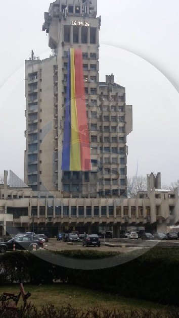 Steagul a fost dat jos pe 24 decembrie, dar astăzi alpiniștii utilitari au început arborarea drapelului imens pe clădirea administrativă, totul în așteptarea evenimentelor programate pentru sărbătorirea Micii Uniri.