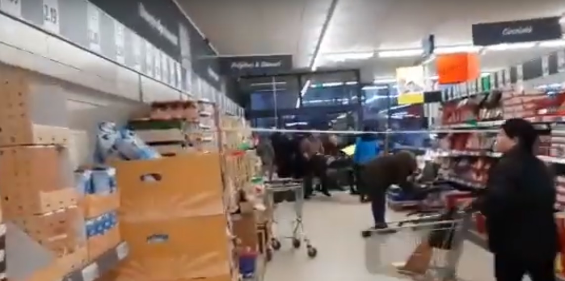 În imagini se pot vedea mai mulți clienți care-și fac cumpăraturile ca și cum în jurul lor nu s-ar întâmpla nimic.