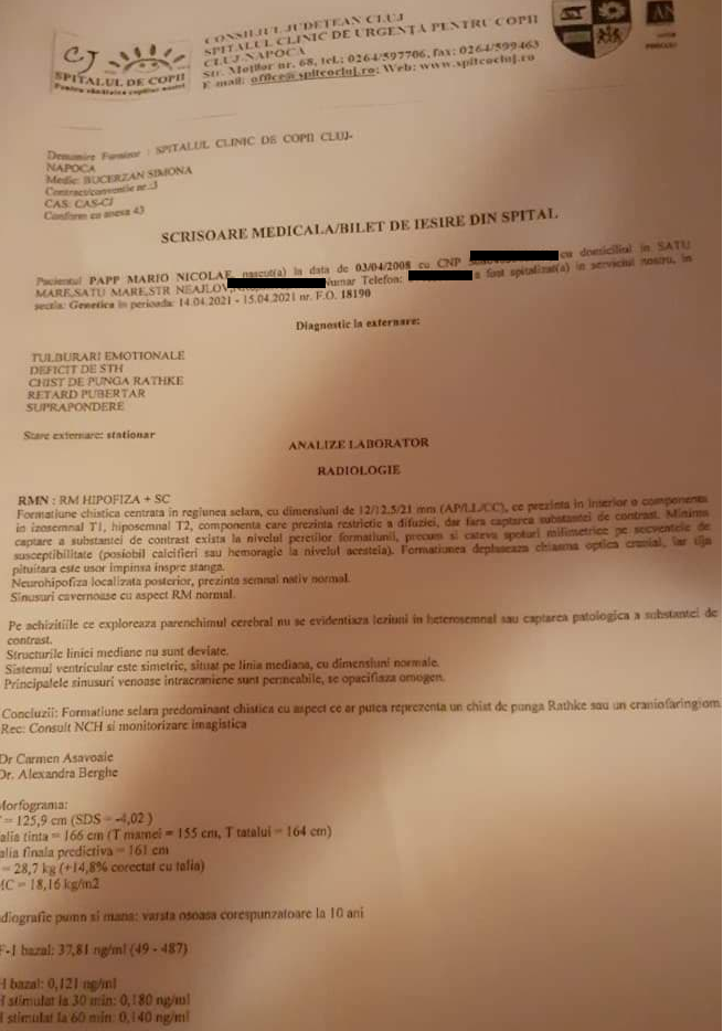”Buna ziua, sunt o mămica cu trei copiii. Băiatul cel mare, de 13 ani, a rămas mic de la vârsta de 10 ani. Am mers Ia Cluj să vedem care e problema şi i-a găsit un chist situat în mijlocul creierului. Trebuie să mergem la operație de urgență și poate sunt oameni care doresc să ne ajute. Mulțumim frumos”, este mesajul Dianei Papp.
