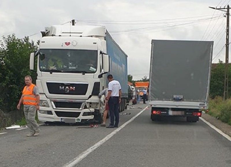 FOTO. Un sătmărean (70 de ani) a adormit și a intrat cu mașina într-un TIR