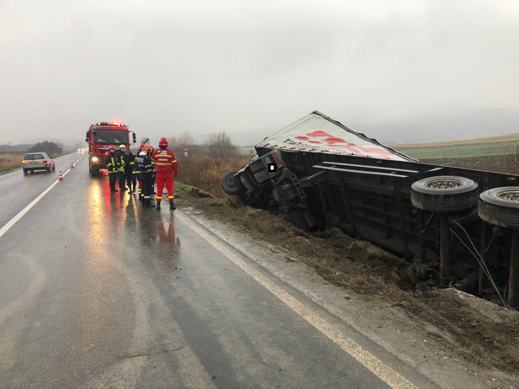 Polițiștii ajunși la fața locului au constatat faptul că un bărbat de 55 de ani, din județul Satu Mare, în timp ce conducea un autocamion de mare tonaj, din direcția Satu Mare către Zalău, a pierdut controlul asupra direcției de deplasare și s-a răsturnat în afara părții carosabile.