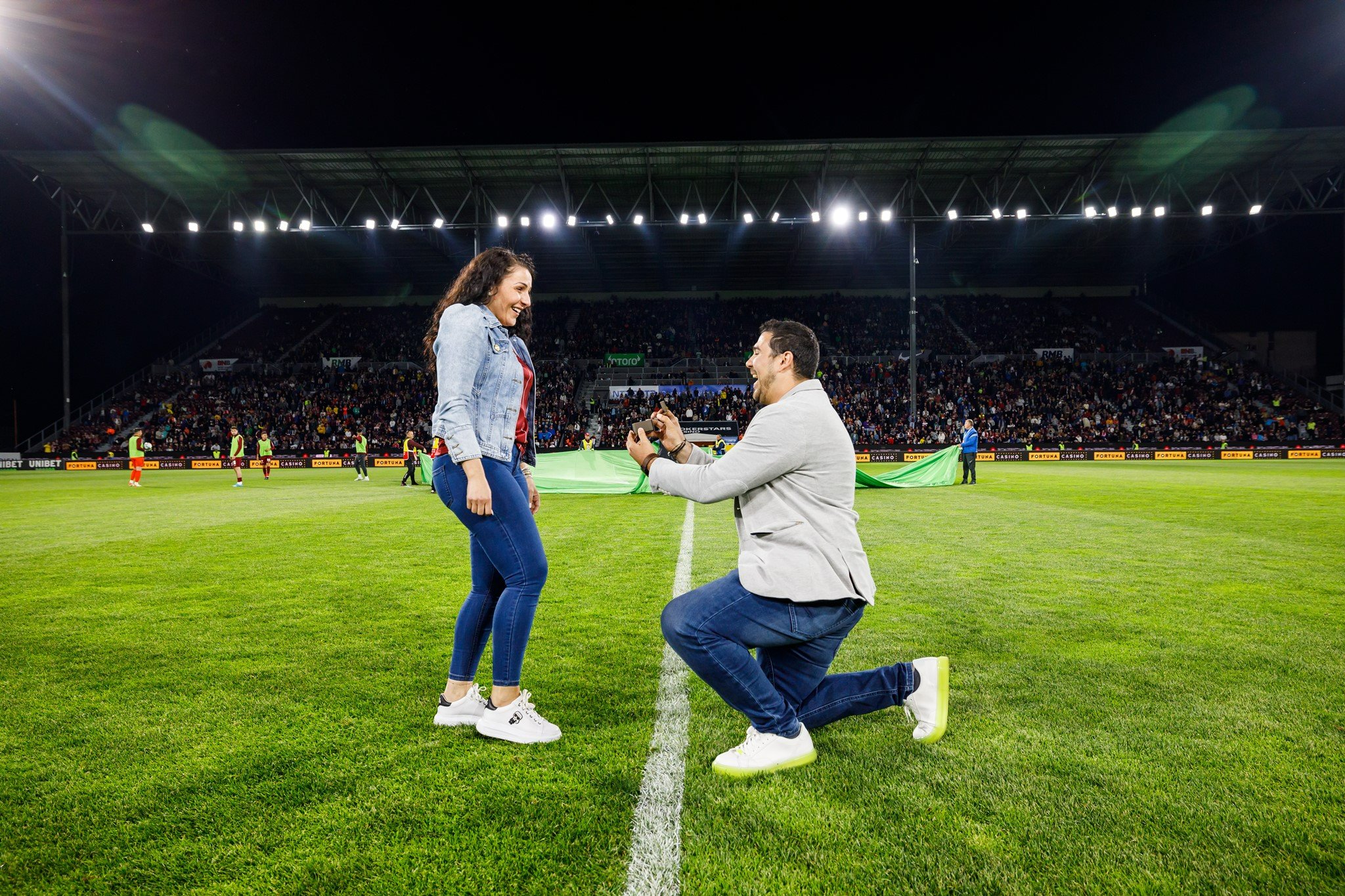 Înainte de startul partidei, a invitat-o pe teren, acolo unde și-a făcut curaj și a cerut-o în căsătorie. Tânăra a acceptat, iar acum cei doi cfr-iști vor forma un cuplu pentru totdeauna.
