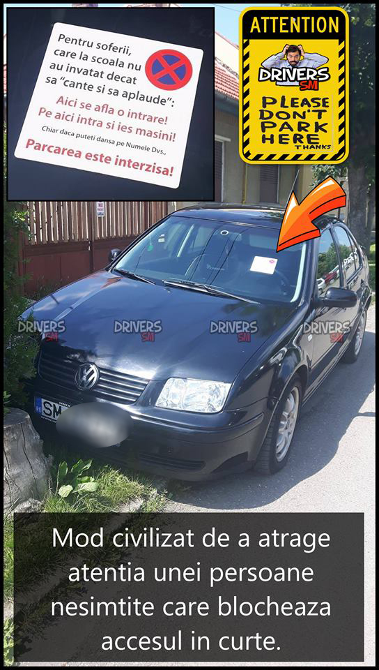 Acesta i-a lipit un autocolant, cu umrătorul mesaj: ”Pentru șoferii care la școală nu au învățat decât să cânte și să aplaude: Aici se află o intrare! Pe aici intră și ies mașini! Chiar acum puteți dansa pe numele dvs. Parcarea este interzisă”.