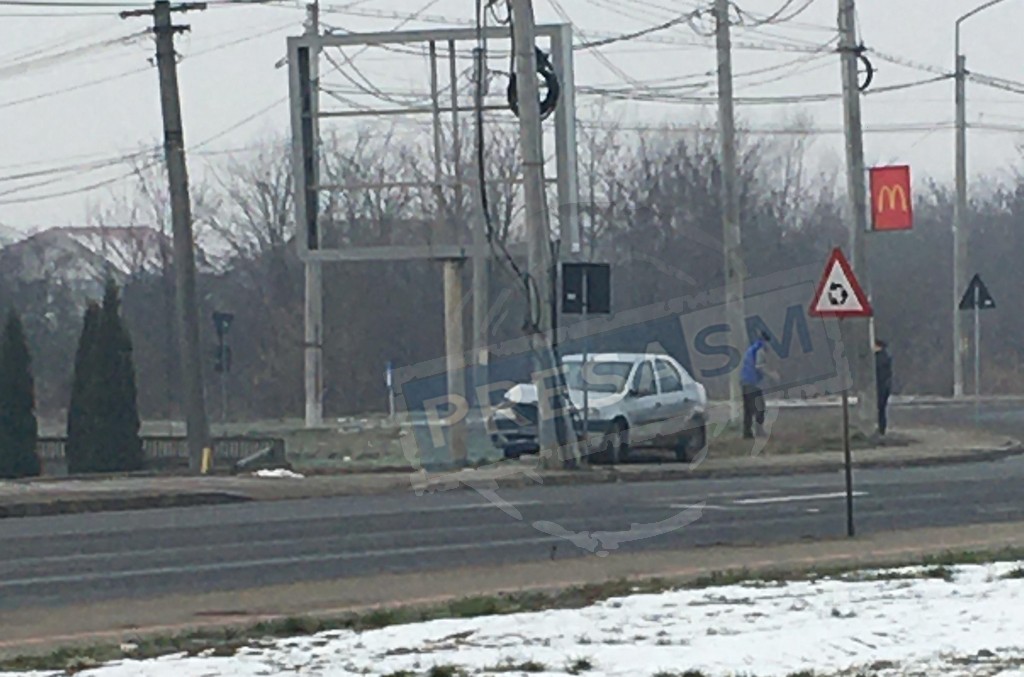 Concret, un șofer, în vârstă de circa 60 de ani, aflat la volanul unui autoturism marca Dacia Logan, nu a adaptat viteza la condițiile de drum, a derapat, iar din sensul giratoriu a ajuns direct într-un stâlp situat pe marginea drumului.