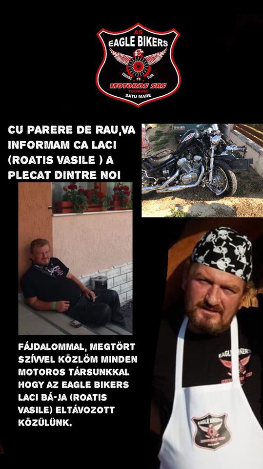 ”Cu părere de rău vă informăm că Laci (Roatiș Vasile) a plecat dintre noi”, au precizat cei de la Eagle Bikers, pe pagina lor de Facebook.