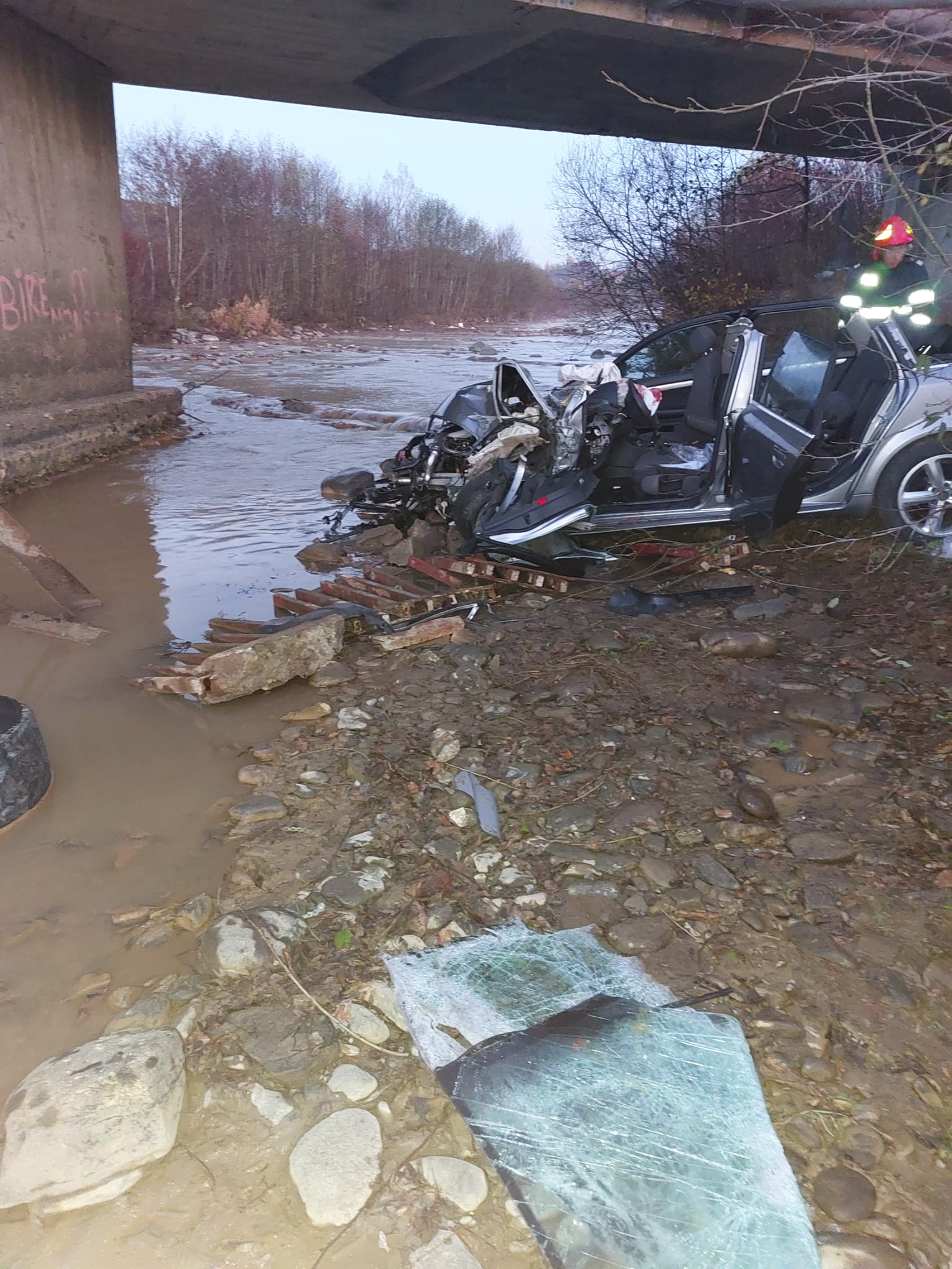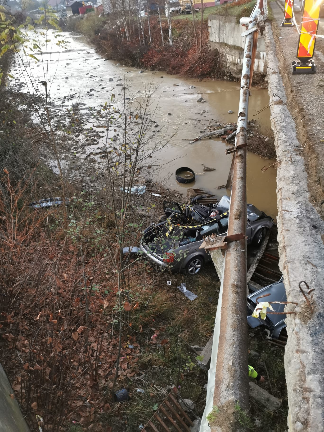 Nenorocire pe drumul județean Târgu Lăpuș - Băiuț, în județul Maramureș. Șoferul unui autoturism a plonjat de pe un pod și a ajuns în albia râului Lăpuș. 4 persoane, 3 bărbați și o femeie, erau în mașina în momentul accidentului, titrează jurnalistul Vasile Dale.