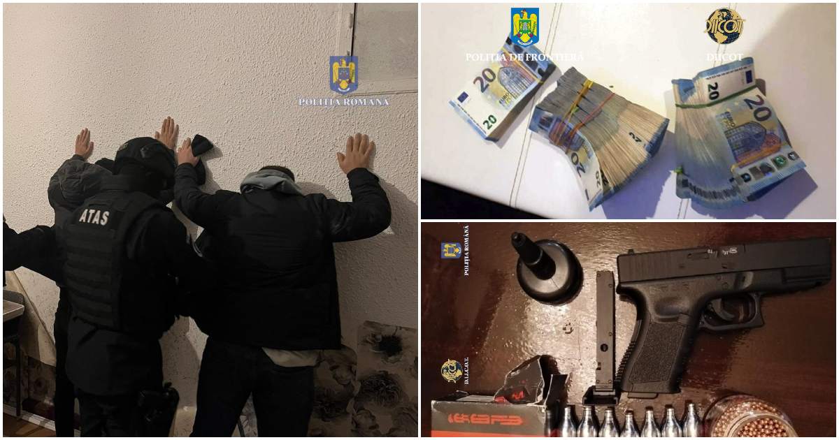 De asemenea, au fost identificate și ridicate, sumele de 86.300 euro, 25.630 lei și 3005 dolari, 3 pistoale cu bile, o cantitate de substanță vegetală , mai multe telefoane mobile și înscrisuri.