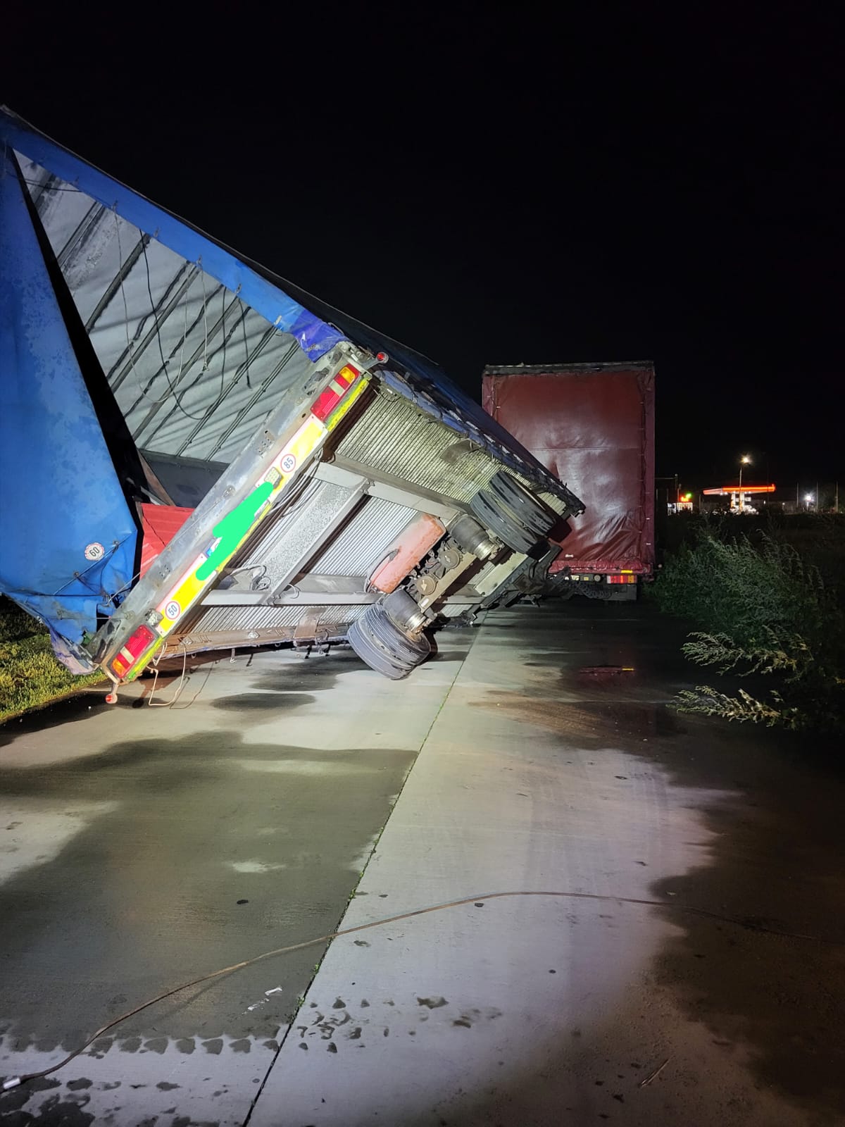 Cei de la ISU au mai intervenit joi seara și la un incident în trafic. Remorca unui TIR s-a răsturnat, tot din cauza vântului puternic.