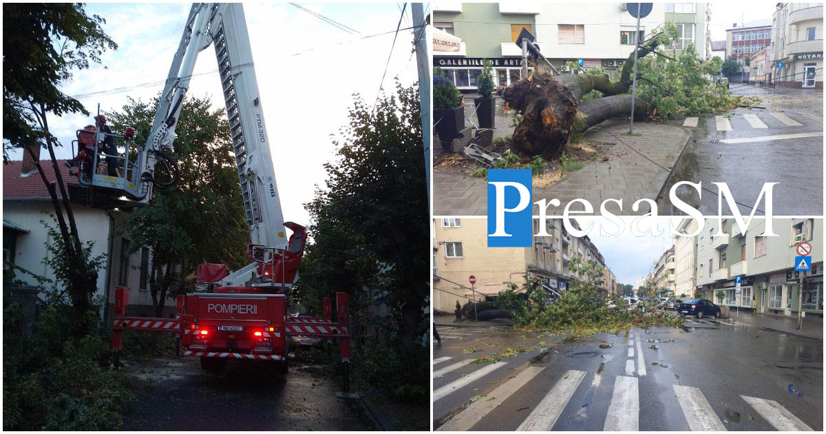 În urma vântului puternic, șase copaci au căzut în municipiul Satu Mare și a fost nevoie de intervenția pompierilor pentru degajarea străzilor blocate. În plus, trei mașini au fost avariate în urma căderilor de copaci.
