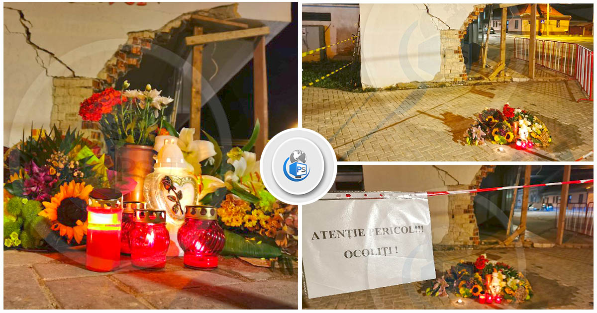 Flori și lumânări au fost depuse în locul în care sătmăreanca de 60 de ani și-a pierdut viața în această dimineață, după ce a fost strivită între un perete prăbușit și o mașină.