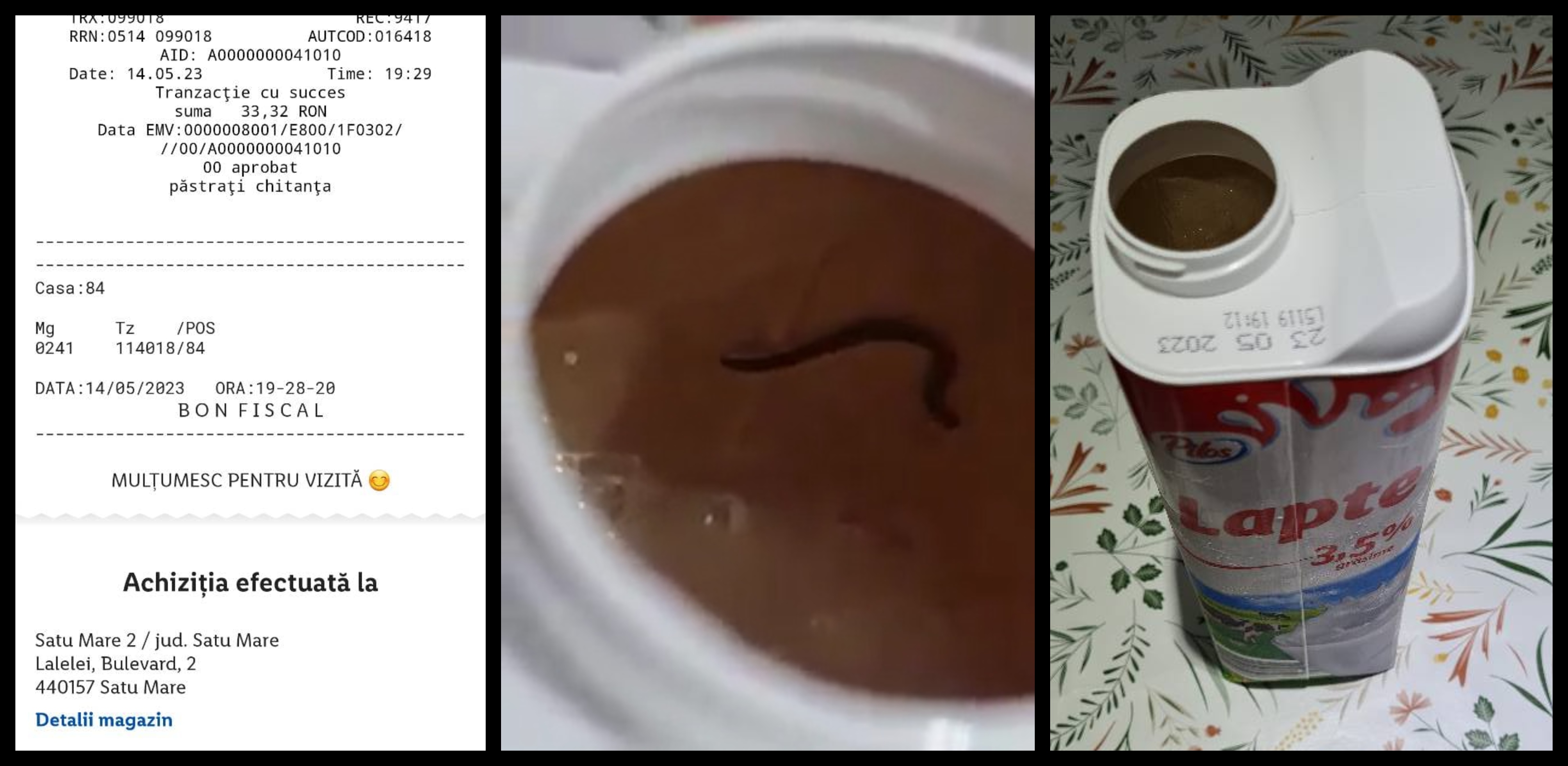 ”Prin această postare aș dori să trag un semnal de alarmă cu privire la calitatea laptelui de consum 3.5% de la Lidl marca Pilos lot: L5119 BBD:23.05.2023 pe care l-am achiziționat în data de 14 mai 2023 și l-am desfăcut în 17 mai, când am băut din el, după care prietena mea a observat prezența unei râme în flacon și unor "puncte" negre sub capac.
