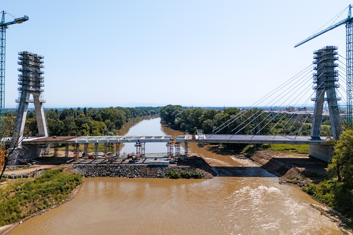 ”Am intrat într-o nouă etapă, realizarea tablierului aferent pilonului de pe malul drept. Structura metalică este aproape de finalizare și estimăm că la sfârșitul lunii iulie să fie recepționat utimul tronson, numărul 18. Urmează ca apoi cele două părți să fie unite printr-un tronson de 5 metri”, a spus managerul de proiect Răzvan Voinea.