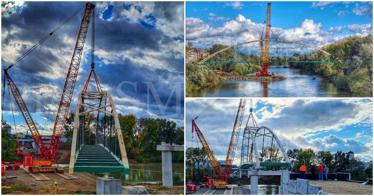 Constructorul a încercat să poziționeze podul pietonal și weekendul, dar au fost înregistrate probleme tehnice, iar în cursul săptămânii trecute deficiențele au fost remediate, iar pasarela a fost prevăzută cu opt tiranți, astfel încât ridicarea și relocare să fie făcute în condiții de siguranță.