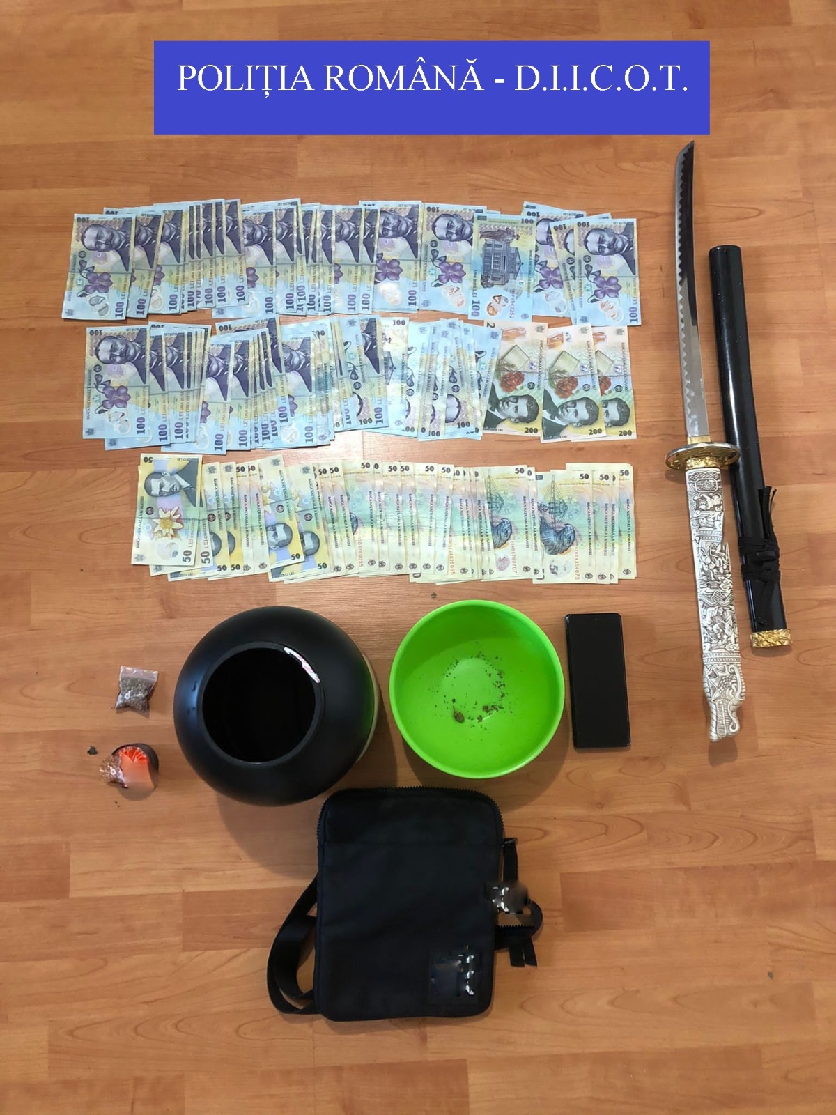 În urma perchezițiilor desfășurate, au fost ridicate 6 telefoane mobile, aproximativ 10.000 de lei și o sabie.