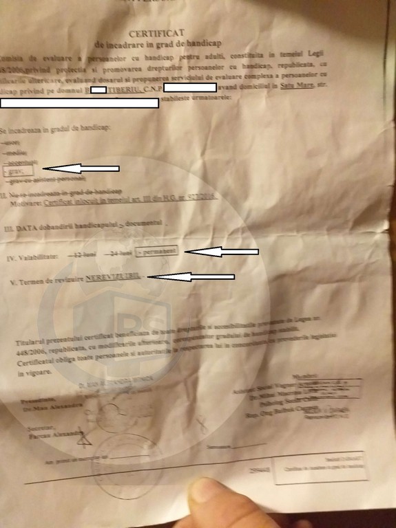 FOTO. Certificatul de handicap care îi conferă dreptul bărbatului să parcheze pe locurile destinate persoanelor cu handicap