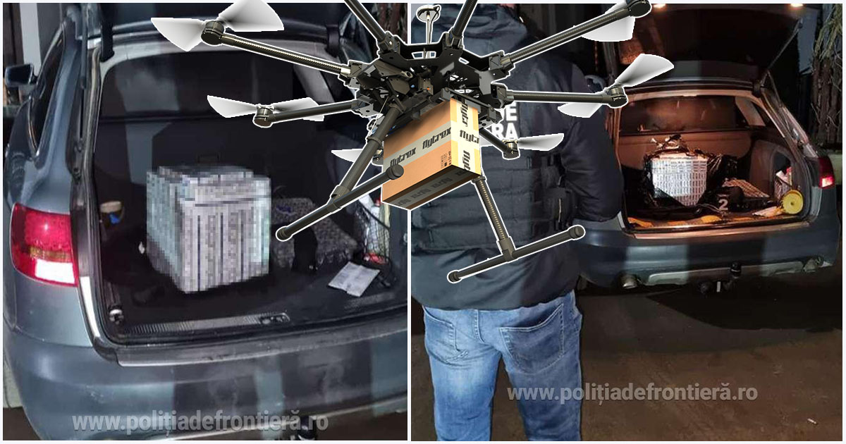 În data de 19 februarie a.c., în jurul orei 23.00, polițiștii de frontieră din cadrul Sectorului P.F. Halmeu – județul Satu Mare, aflați în misiune de supraveghere a frontierei de stat, au observat, pe direcția localității Porumbești, un aparat de zbor de mici dimensiuni (dronă), care transporta un colet. În urma cercetării zonei, polițiștii de frontieră au depistat, în apropierea localității, la aproximativ 2 km de frontiera cu statul vecin, două persoane care au preluat un colet învelit în folie neagră și l-au încărcat într-un autoturism.