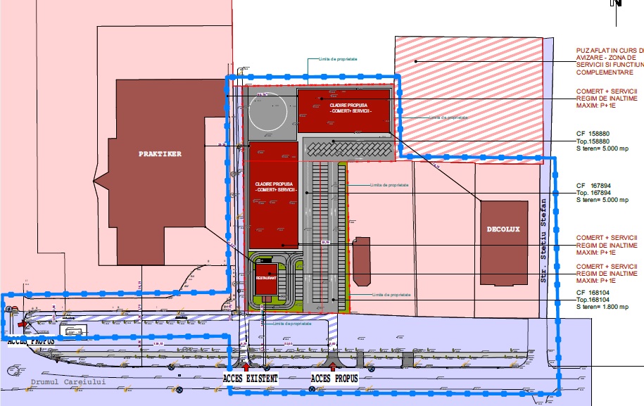 Proiectul prevede realizarea unor construcții pentru comerț și servicii pe întreaga suprafață de teren deținută de beneficiar, ceea ce presupune extinderea intravilanului, prin includerea parcelei situate actualmente în extravilan.