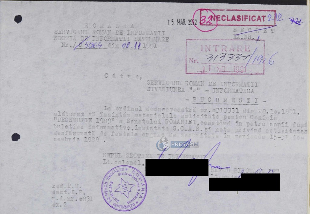 O serie de documente desecretizate de către Serviciul Român de Informații - consultate de PresaSM - arată starea de spirit din județul Satu Mare, din perioada de dinaintea și după Revoluția din decembrie 1989, transformată ulterior într-o lovitură de stat orchestrată de tovarășul Ion Iliescu și camarila sa militaro-securistă.