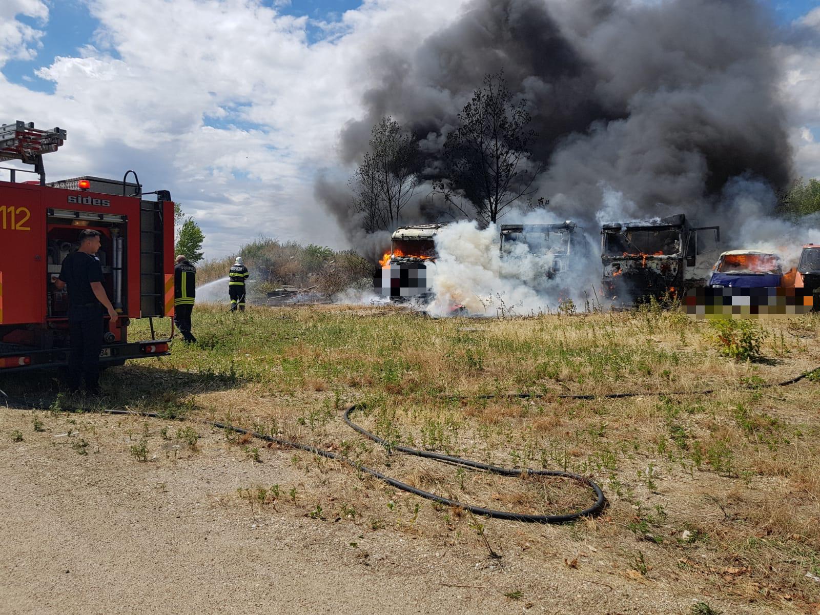 A kiszáradt fű meggyulladásának következtében négy teherautót és két munkagépet emésztettek fel a lángok.