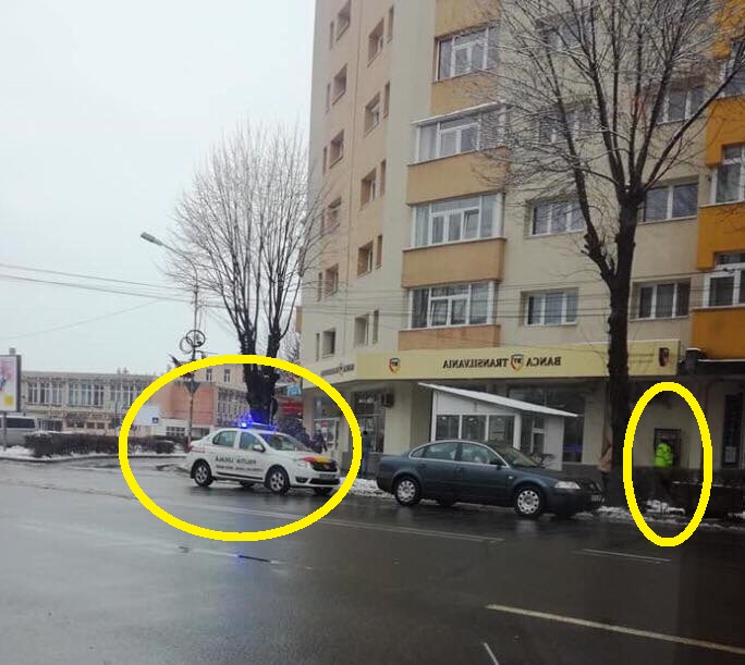 Reporterii ObiectivSM au prins o astfel de scenă pe Bulevardul Independenței. Echipajul de ”poliție rutieră” al Poliției Locale Satu Mare a staționat în loc interzis, tocmai pentru ca un agent să poată să meargă la bancomat, pentru a-și scoate niște bani.