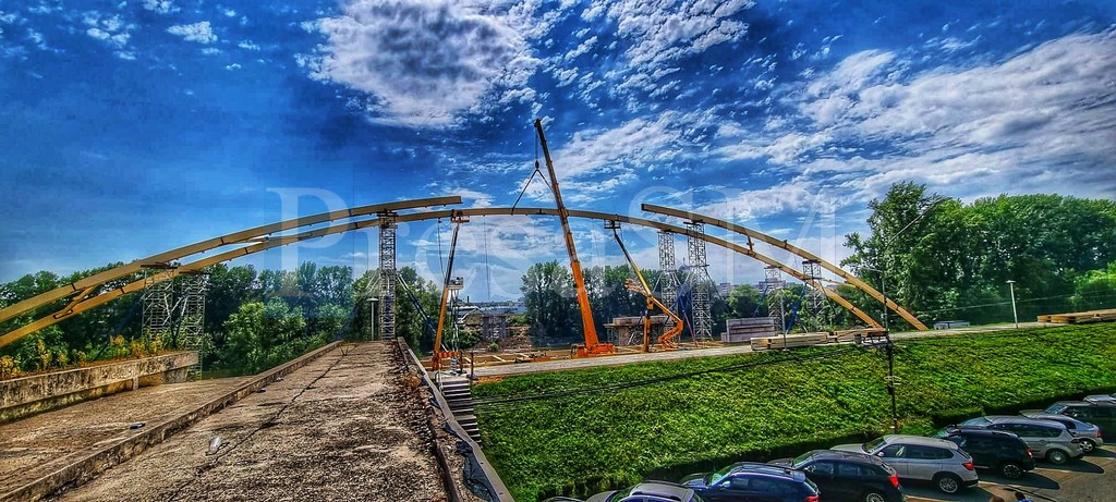 Asamblarea tablierului pasarelei pietonale se apropie de final. Este una dintre cele mai dificile și complexe etape din proiect, iar în cursul acestei luni, autoritățile se așteaptă ca să urmeze și suprapunerea, cu ajutorul unei macarale, peste structura de beton. Abia apoi proiectul va intra în faza de realizare a elementelor ușoare.