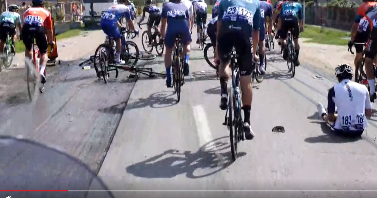Ce rușine! Din cauza porțiunilor de drum decapat, mai mulți bicicliști participanți la Turul României s-au accidentat, căzând de pe biciclete în zona Ambud-Petin din județul Satu Mare.